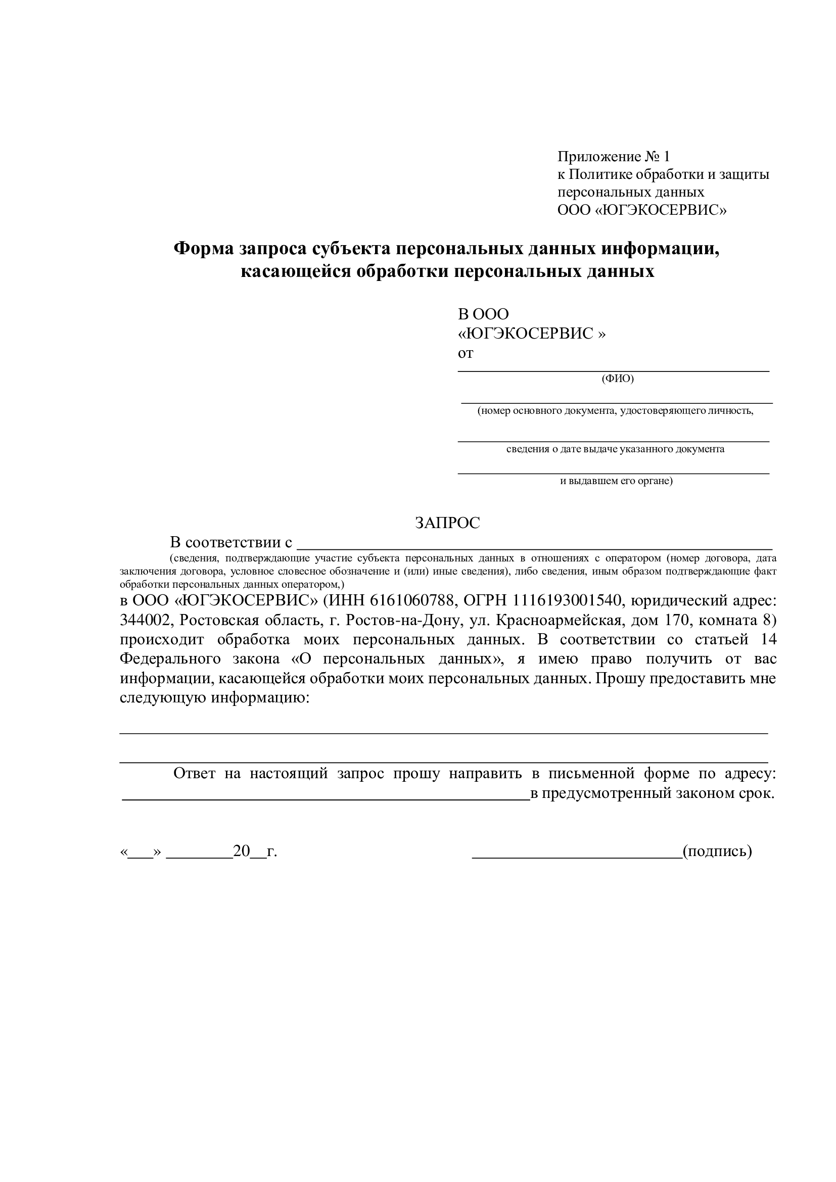 6.8. Для получения информации, указанной в п. 6.5.1, субъект (или его представитель) обязан заполнить форму запроса (Приложение 1 или 5) и направить его лично уполномоченным сотрудникам Общества либо почтовым отправлением.