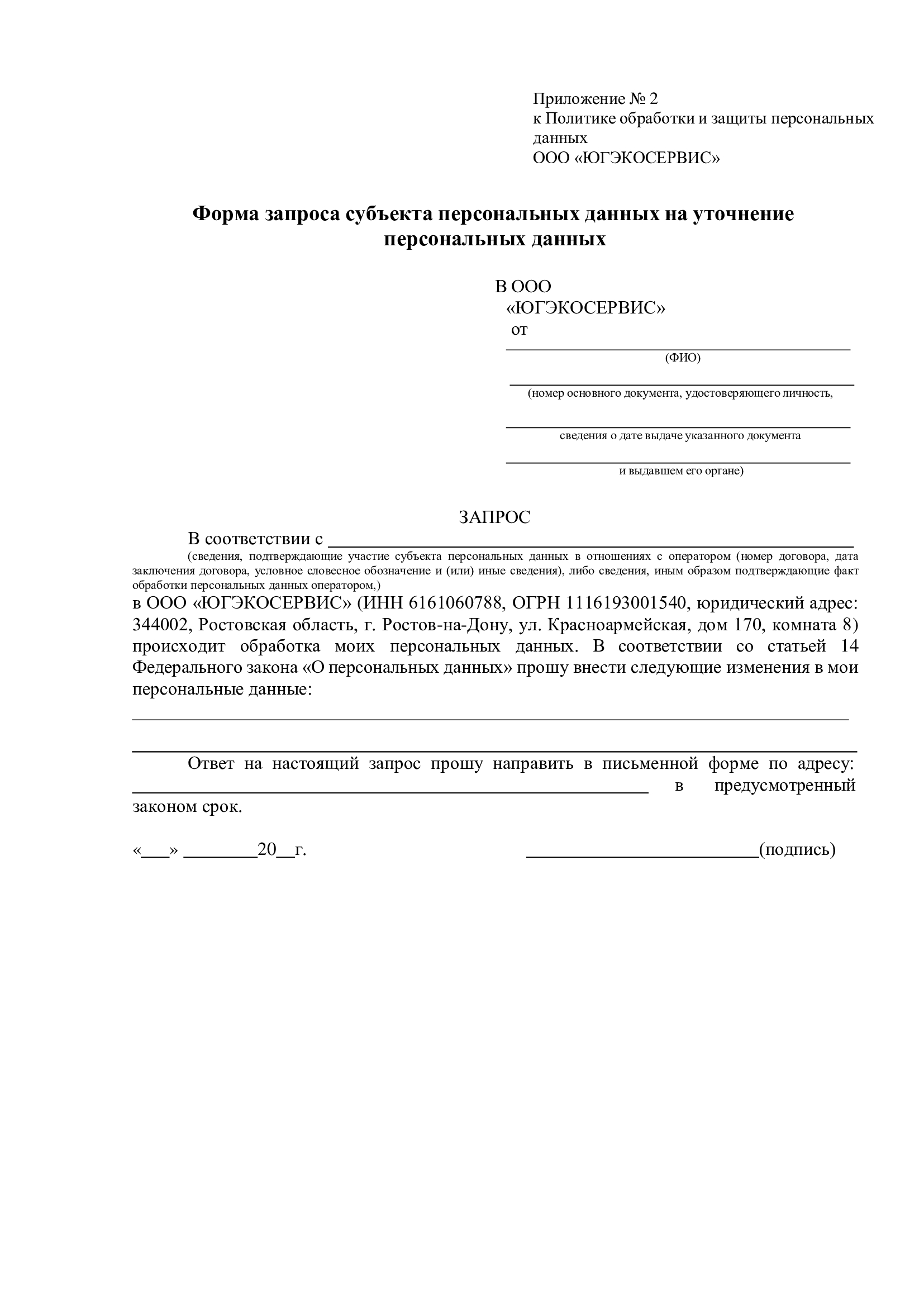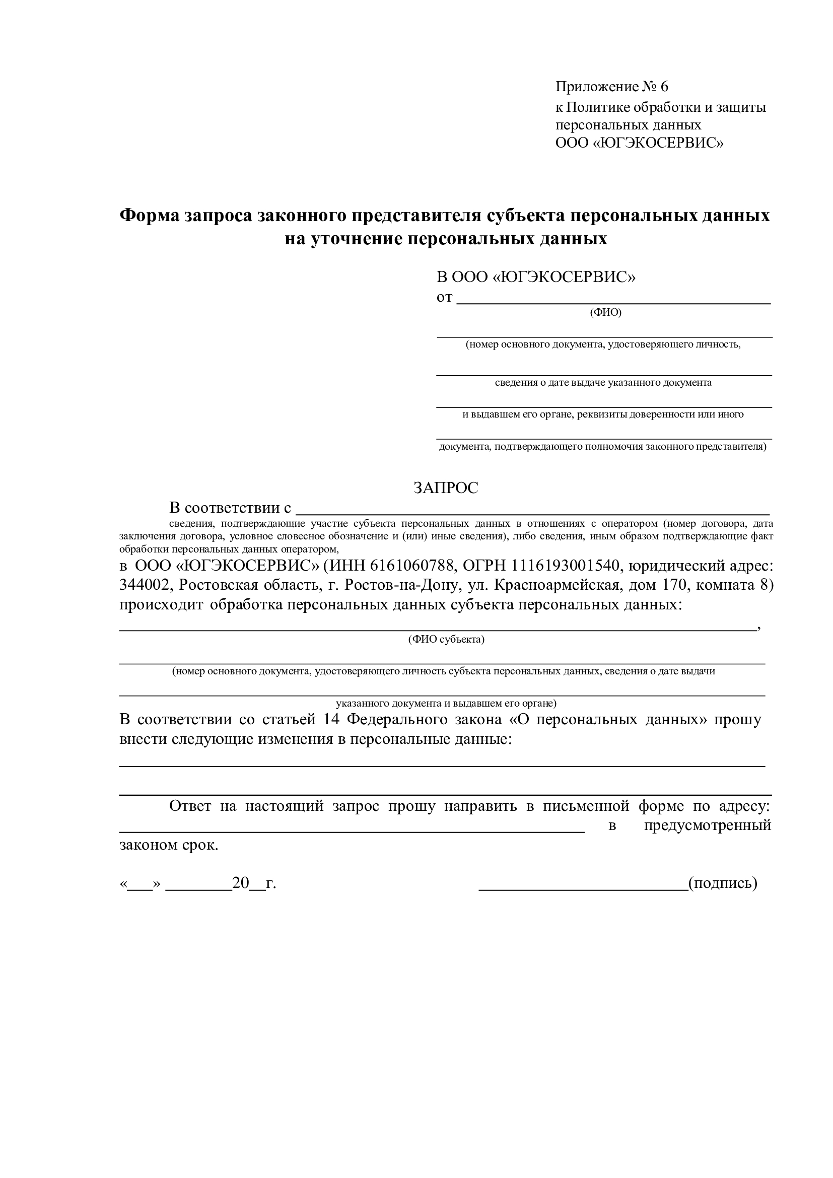 6.9. Для уточнения персональных данных субъект (или представитель) заполняет соответствующую форму запроса (Приложение 2 или 6) и передает его указанным в п. 6.8 способом.